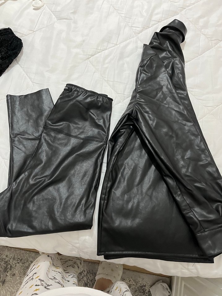 Düğmeli, uzun kollu siyah deri biker ceket. Normal kesim, çıtçıtlı ve çantalı. Günlük rahat kullanıma uygun. Dar kesim Deri pantolon