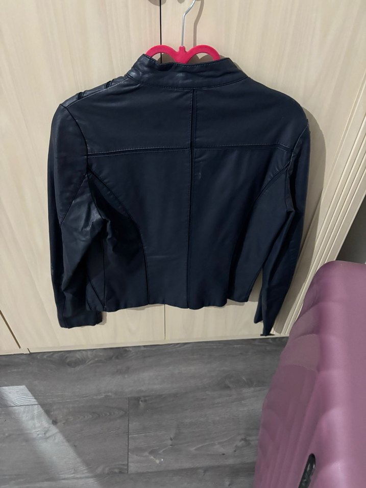 Düğmeli, uzun kollu, yakası kesimli siyah deri biker kadın cekettir. Normal midi boyda ve günlük kullanım için uygundur.