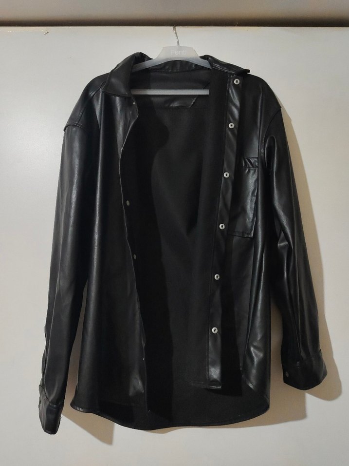 Düğmeli ön kısmı ve kesik yakasıyla siyah deri ceket. Uzun kollu, midi boy ve bol kesim, günlük sokak stiline uygun. kadın ,erkek giyebilir