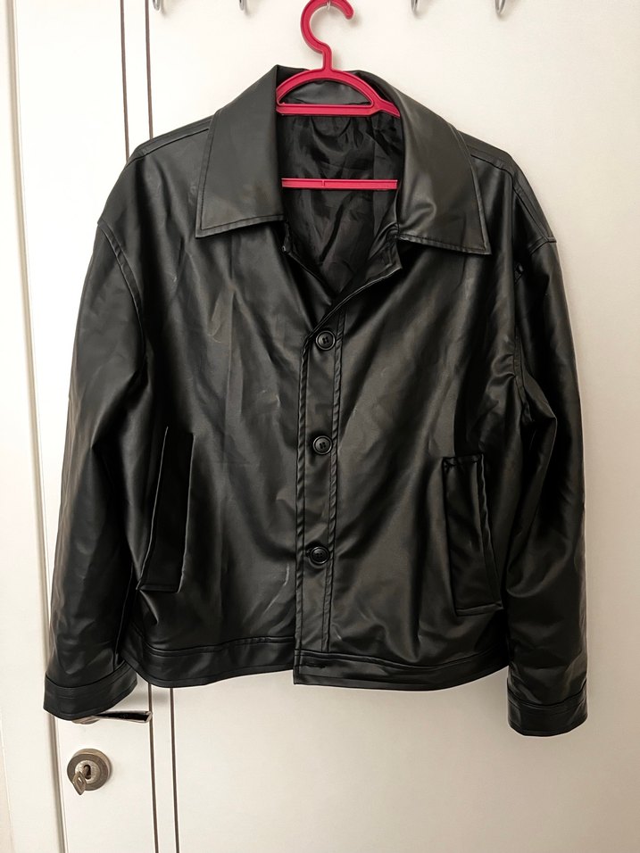 Düğmeli ön kısmı ve keskin yakasıyla siyah deri ceket, günlük sokak stili için rahat ve minimalist tasarıma sahiptir. Uzun kollu ve normal kesimdir.