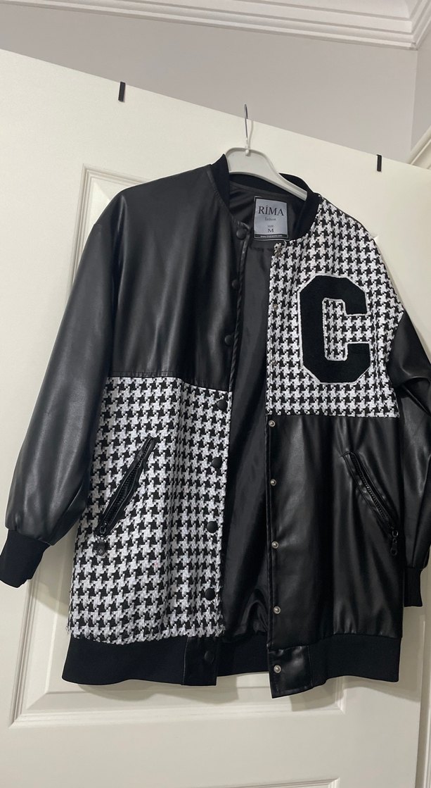 Düğmeli, uzun kollu, baskılı desene sahip siyah deri bomber ceket. Salaş kesimli ve normal boyda, günlük sokak stiline uygundur.