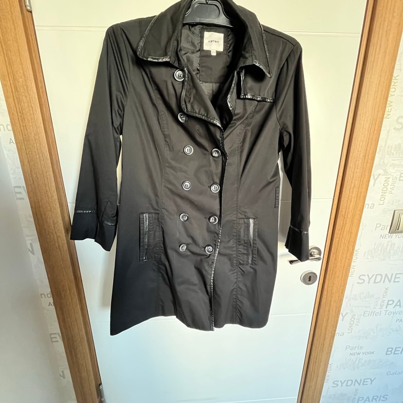 Düğmeli önü ve keskin yakasıyla siyah deri, fitted kesim midi trençkot. Kemeri yok küçük kusurları var fotoğraflarda mevcuttur