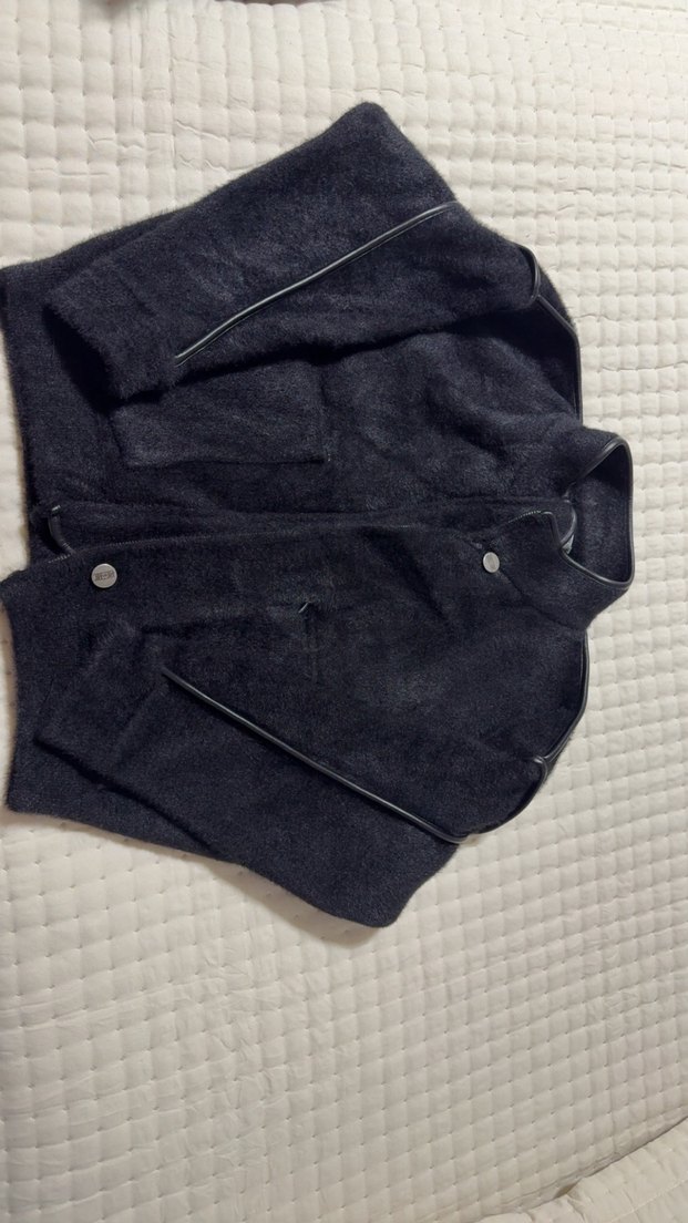 Düğmeli siyah deri detaylı angora iplik kadın triko ceket