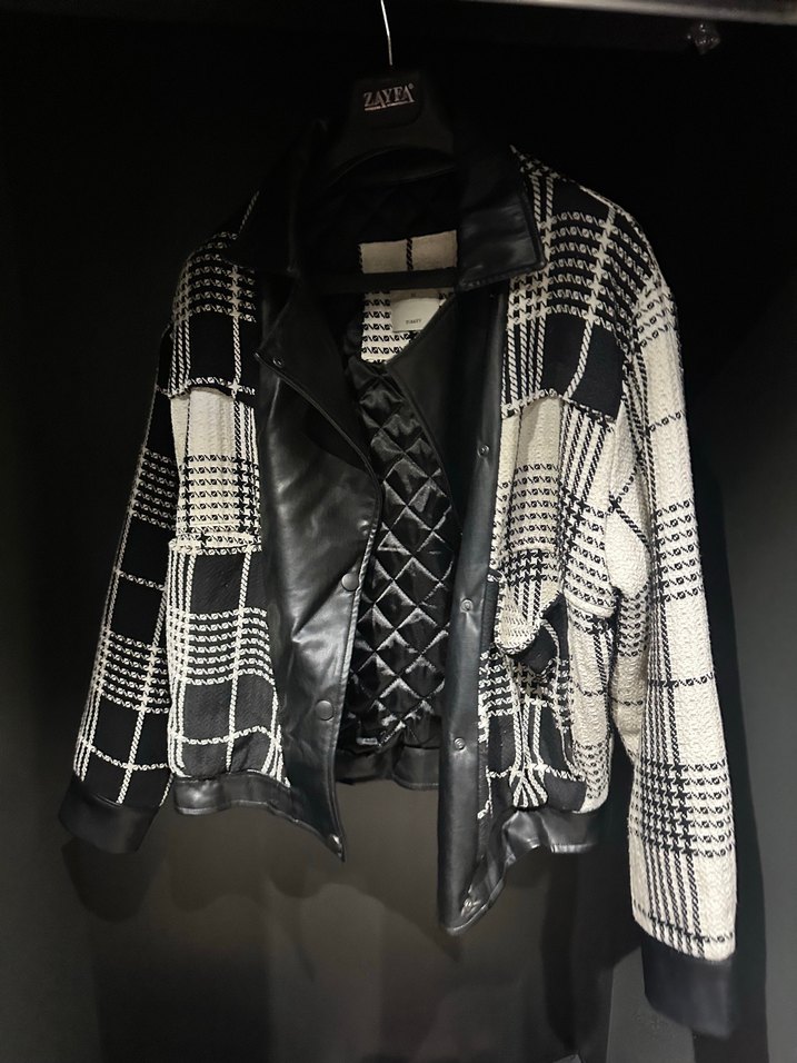 Düğmeli, ekose desenli ve kesik yaka detaylı kadın ceketi, deri ve kumaş karışımıdır. Normal boyda ve regular fit, günlük kullanıma uygundur. Marka: ZAYEX.