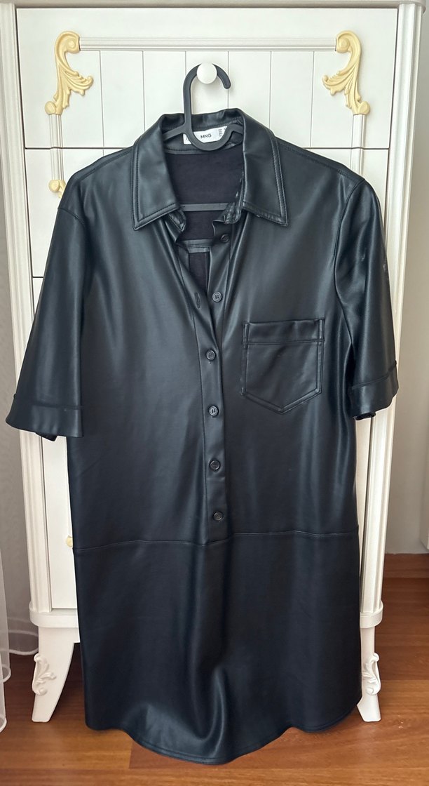 Sadece 1 kez oğlumun yaş gününde giydim. Dedormesı yok.Düğmeli, kısa kollu, yakalı siyah deri ceket. Göğüs cebine sahip, bol kesim ve midi boyda, ofis için uygun.