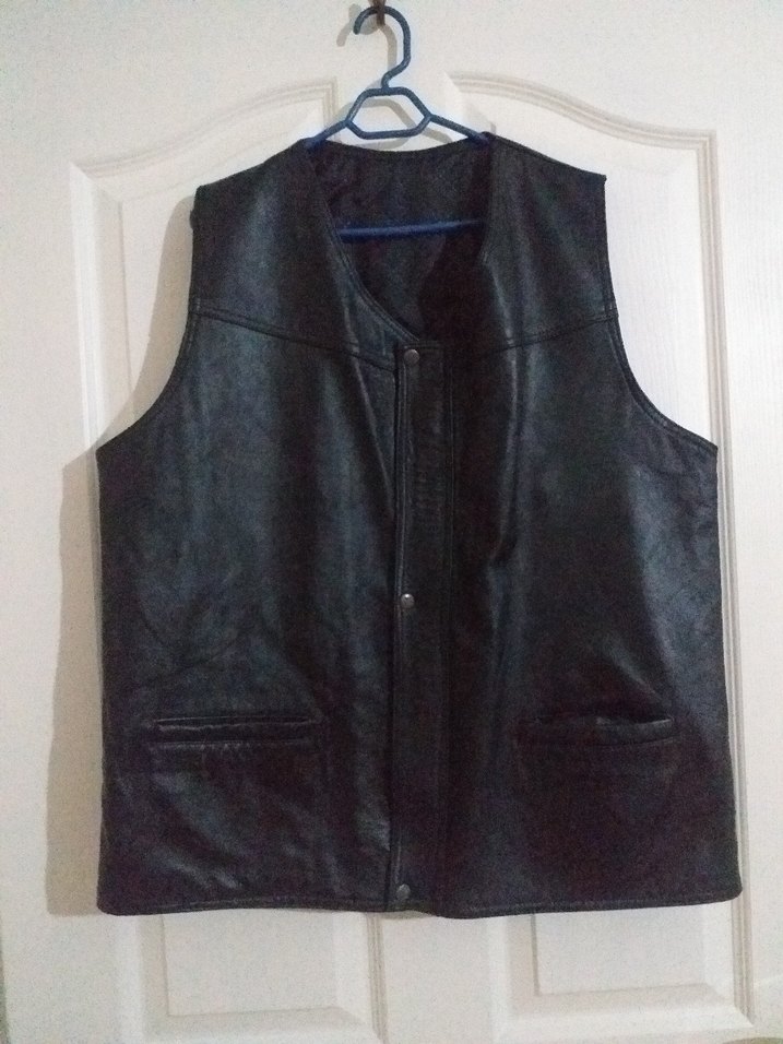 Düğmeli, siyah deri, kolu olmayan erkek biker yelek. Notlu yaka ve iki ön cep bulunur. Günlük kullanıma uygundur.