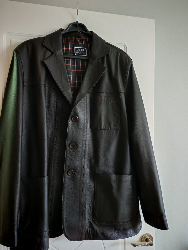 Erkek için siyah deri ceket, düğmeli ve kesik yakalıdır. Uzun kollu, midi boyda ve klasik biker tarzında, ofis kullanımı için uygundur.