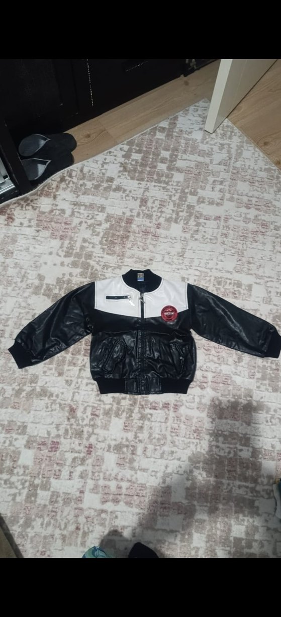 Düğmeli ön kısmı ve baskılı deseni olan, siyah deri erkek çocuk ceketi. Fitted kesimi ve bisiklet yaka detayıyla dikkat çeker.