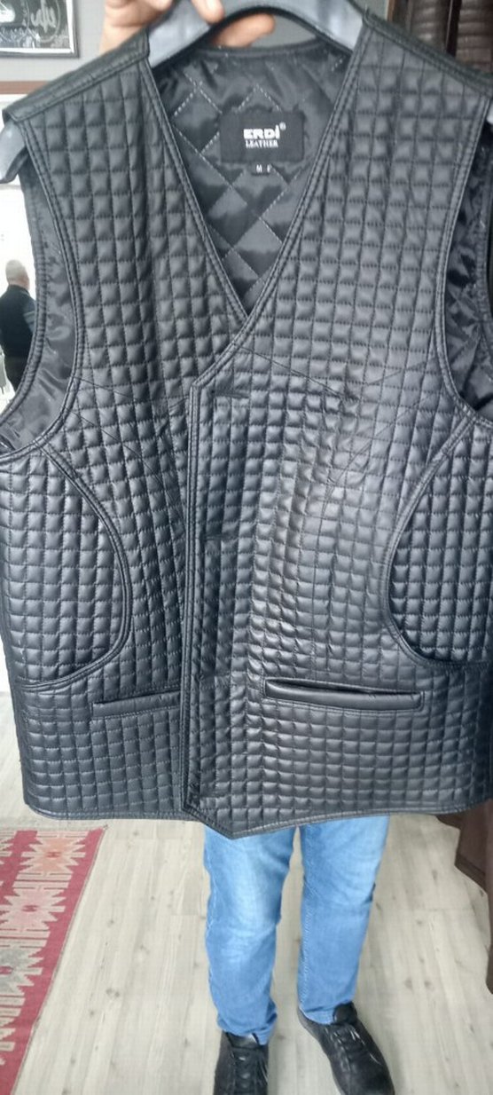 Siyah kapitone desenli, düğmeli, yakalı ve kolsuz deri erkek yelek. Günlük sokak stili için uygun, normal kesim.