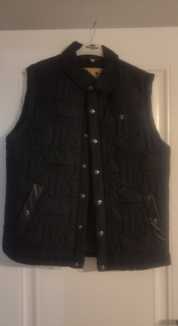 Düğmeli, siyah deri yelek, kolsuz ve normal boyda. Notlu yakası ve dar kesimiyle günlük rahat kullanıma uygun.