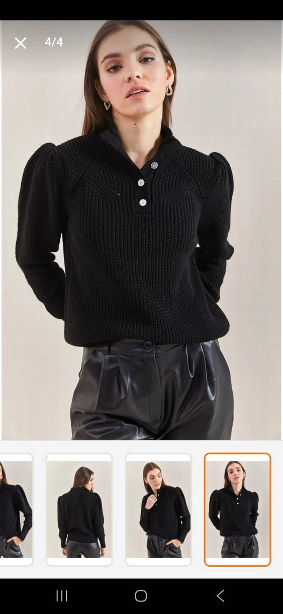 Siyah renkli, deri görünümlü, düğmeli, yüksek yakalı ve uzun kollu, bol kesim triko kazak. Günlük sokak tarzına uygun.