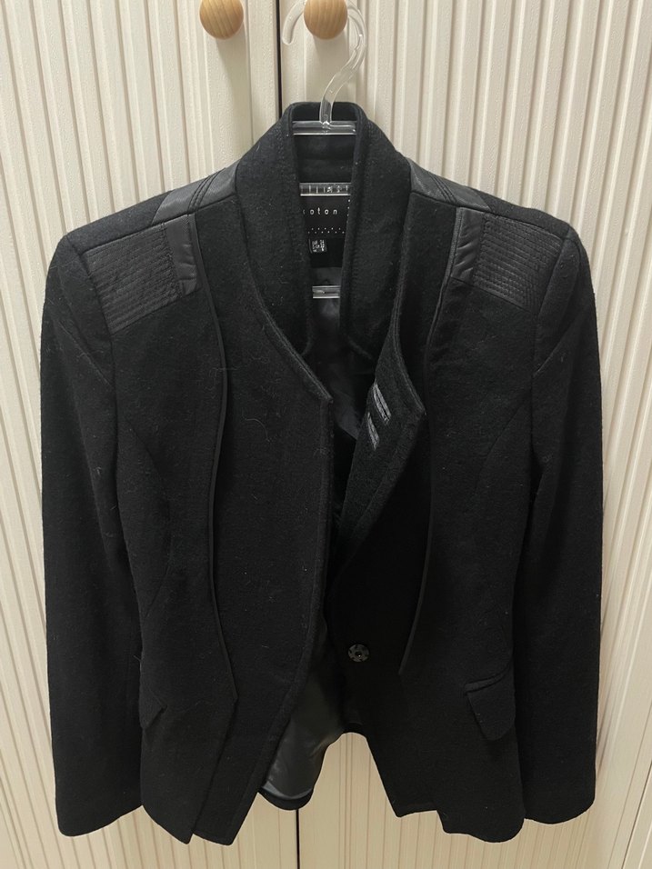 Siyah deri kadın blazer ceket, düğmeli ön, kesik yaka ve uzun kolludur. Orta uzunlukta, regular fit ve goth iş tarzını yansıtır.