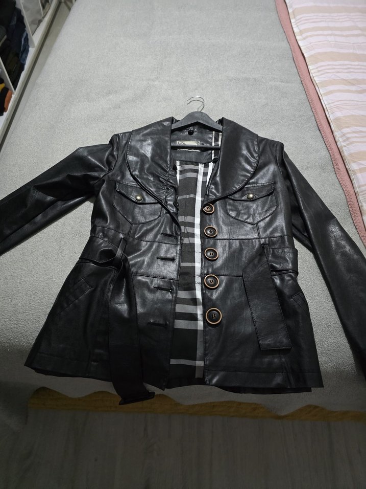Düğmeli, siyah deri kadın ceket, yakalı ve midi boyda. İnce kesim ve bantlı kollarıyla trend sokak stiline uygun.Tertemiz kusursuz