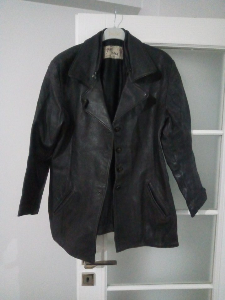 Düğmeli, siyah deri kadın ceket. Klasik biker tarzında, normal midi boyda, notched lapel yakalı ve strappy kollu. Ofis kullanımı için uygun, regular fit.