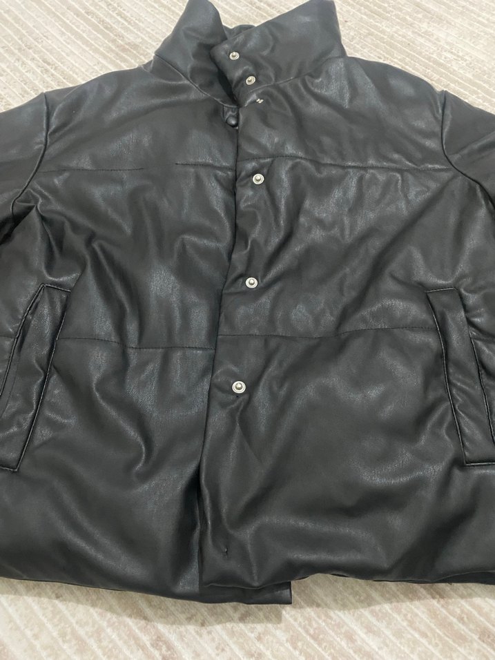 Bu siyah deri kadın ceket, düğmeli kapama ve yakalı tasarıma sahiptir. Uzun kollu ve bol kesimli olup midi uzunluktq, yaka ve kol kısmında deforme var, alt düğme yok, ceket kapandığında yaka kısmı fazla belli olmuyor uyguna satışta