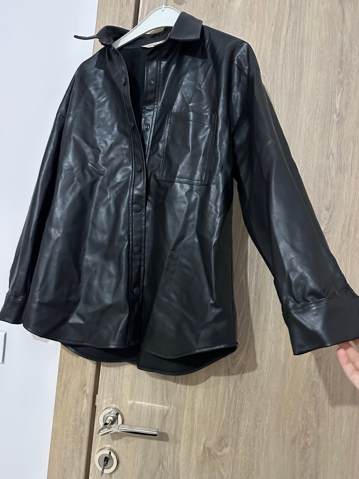 Düğmeli, siyah deri ceket; notalı yaka, uzun kollu ve bol kesimdir. Midi boyda, desen içermeyen yüzeyiyle günlük sokak stili için uygundur. 36-38 beden