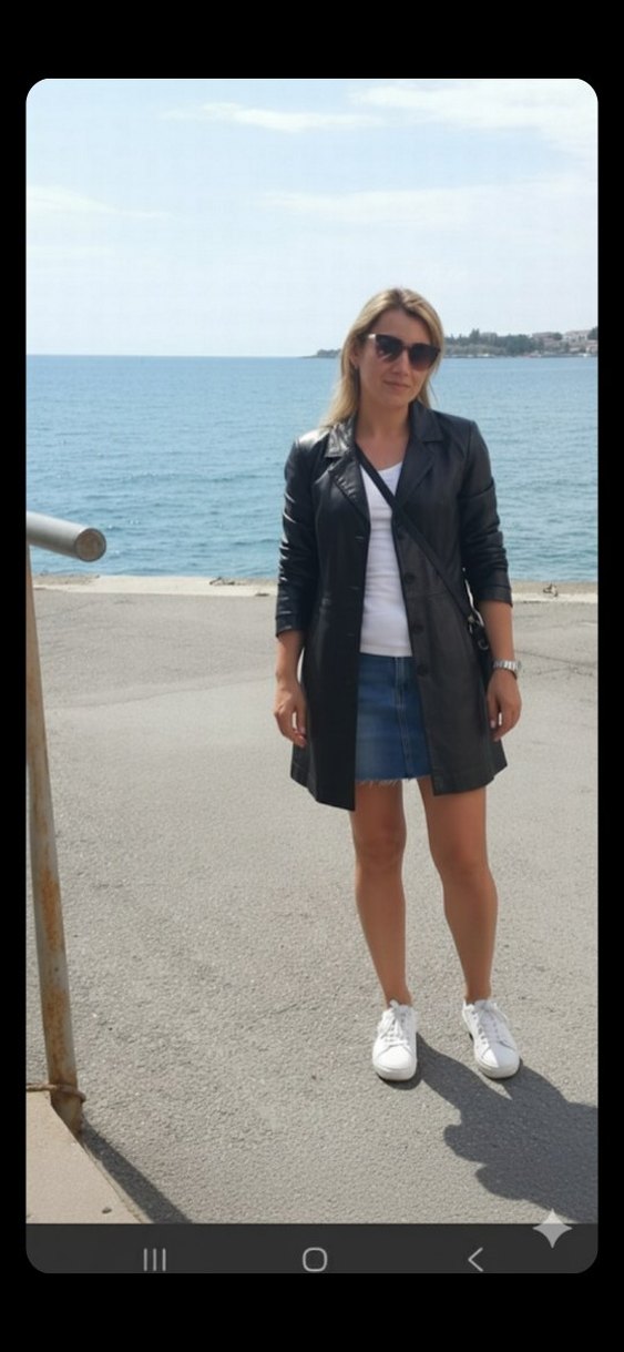 Düğmeli, siyah deri kadın ceket, klasik ve gotik tarzda. Normal kesim, uzun kollu