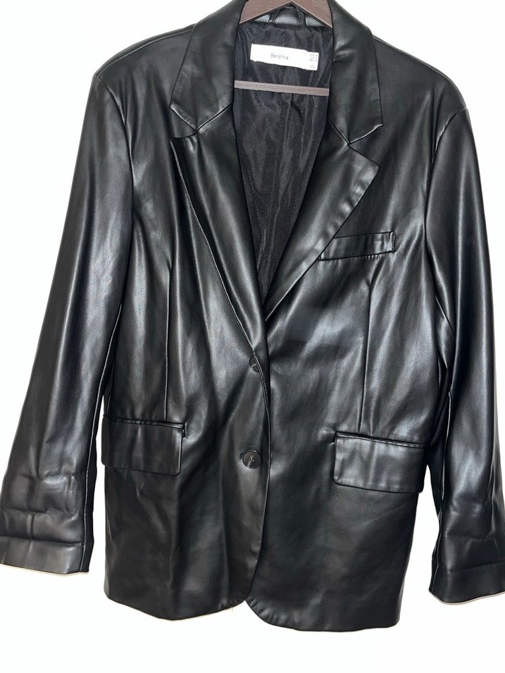 Düğmeli siyah deri kadın ceket, keskin yakalı ve midi boydadır. Strappy kollu ve normal kesimdir, ofis için uygundur.