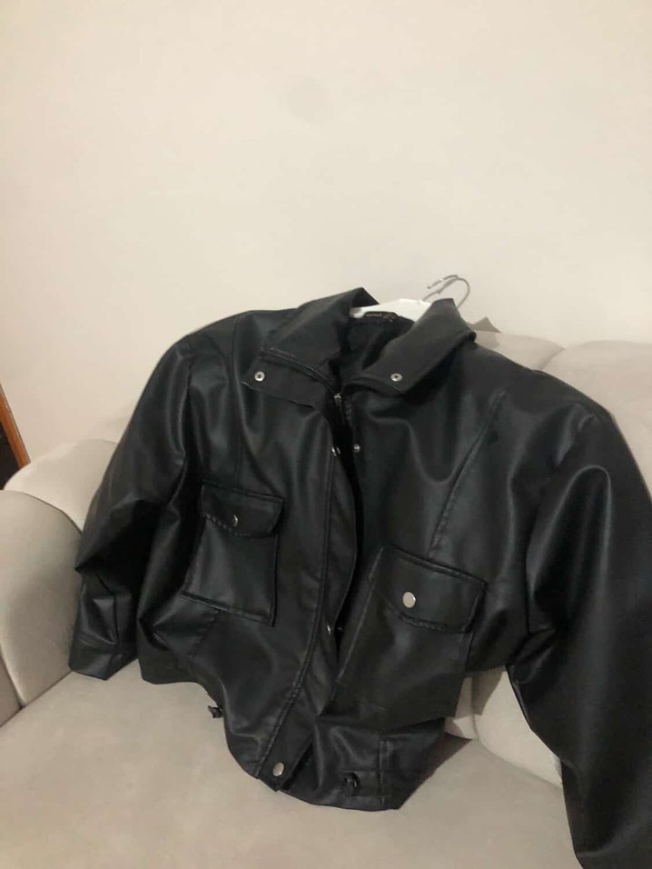 Bu siyah deri ceket, düğmeli ön, yakalı tasarım ve askılı kollara sahip günlük sokak stiline uygun.