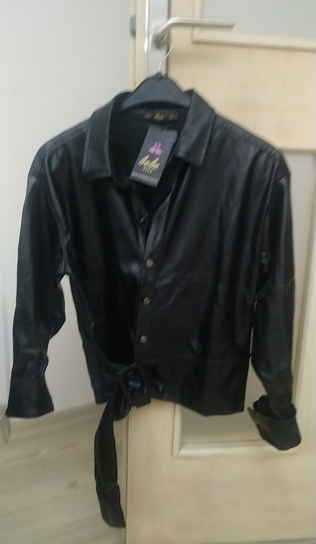 Düğmeli ve kuşaklı, uzun kollu siyah deri kadın gömlek. Notlu yaka ve bol kesimi ile klasik ve gotik tarzı bir araya getirir.