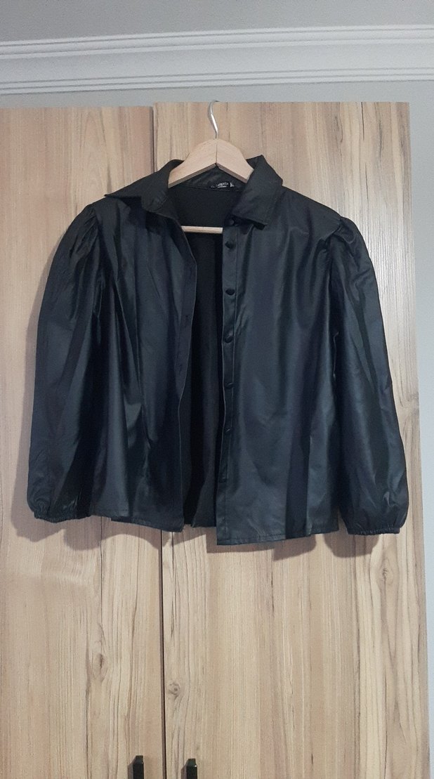 Düğmeli, siyah deri kadın ceket. Uzun kollu, kruvaze yakalı ve midi boyda, rahat kesime sahip. Ofis kullanımı için uygundur. marka temsili
