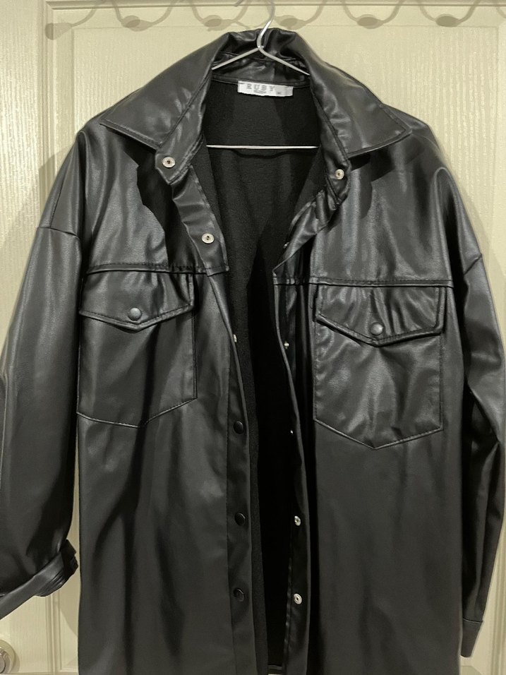 Düğmeli, uzun kollu, notalı yaka detaylı siyah deri ceket. Rahat kesimi ve cep detaylarıyla günlük sokak stili için uygun.