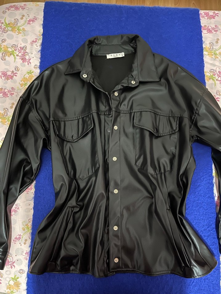Düğmeli ön kısmı, uzun kollu ve kesik yaka detaylı siyah deri ceket. Salaş kesimi ve midi boyuyla günlük sokak stiline uygun rahat bir parça.
