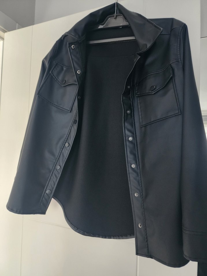 Düğmeli önü ve kesik yaka detayıyla siyah deri kadın ceket. Uzun kollu, midi boy ve rahat kesimdir. Günlük sokak stiline uygundur. düğmelerin de soyulma harici bir sorunu yoktur