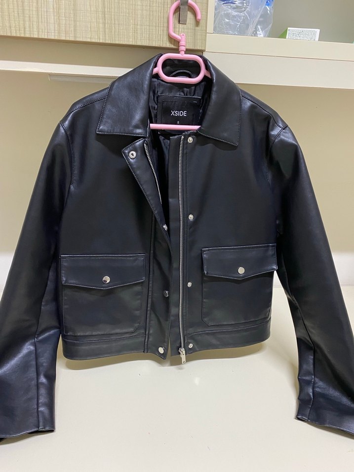Düğmeli cepleri ve geniş yakasıyla siyah deri kadın ceket, uzun kollu ve midi boydadır. Günlük sokak stili için uygundur.