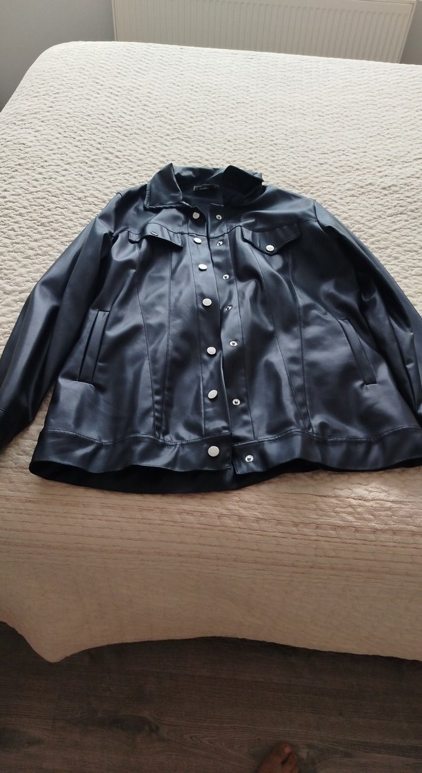 Düğmeli, uzun kollu, siyah deri kadın ceket. Gevşek kesim, parlak yüzey ve yaka detayına sahip, gündelik kullanıma uygun goth tarzında.
