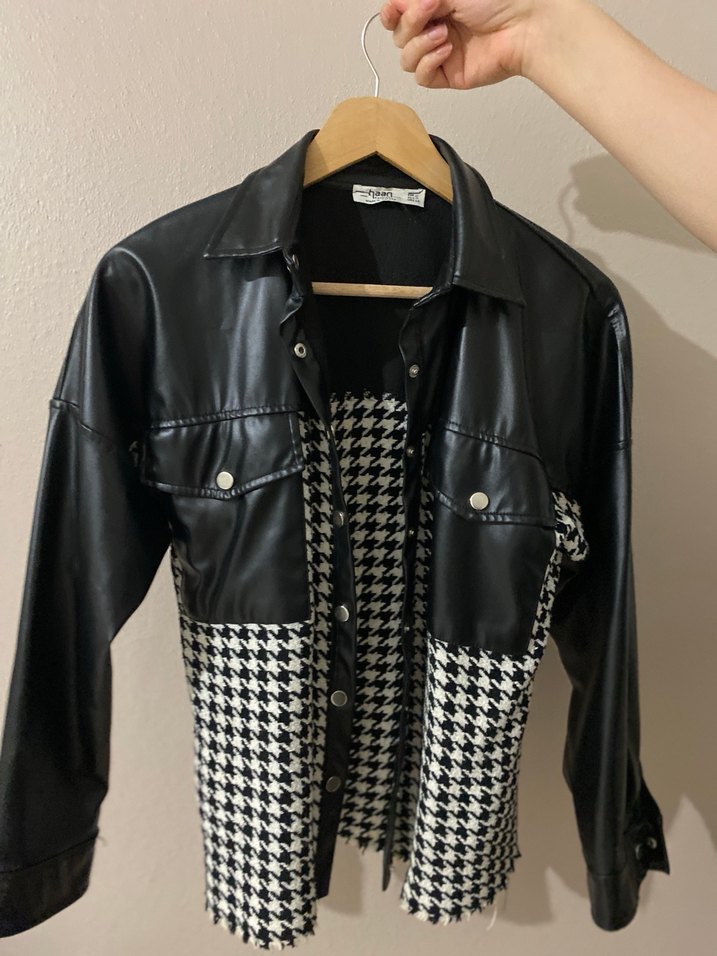 Düğmeli cepleri ve uzun kollu siyah deri ceket dolanımda uzun zamandır duruyor 1 2 kere giyilmiştir