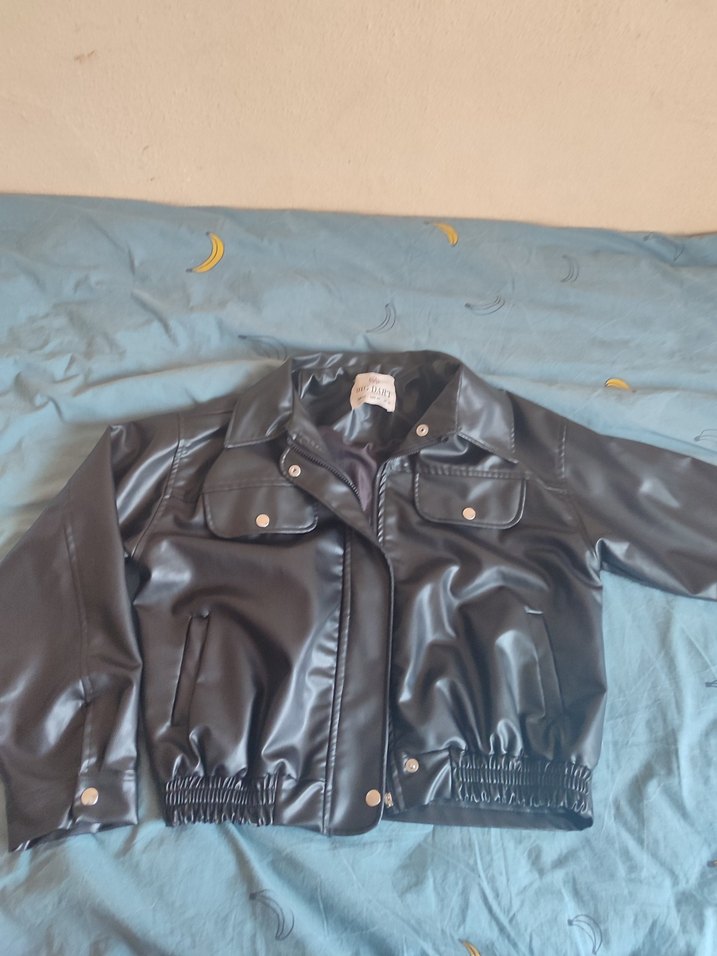 Uzun kollu, düğmeli ve kesimli yakalı siyah deri ceket. Bol kesim ve lastikli bel detayı ile günlük sokak stili için uygundur.