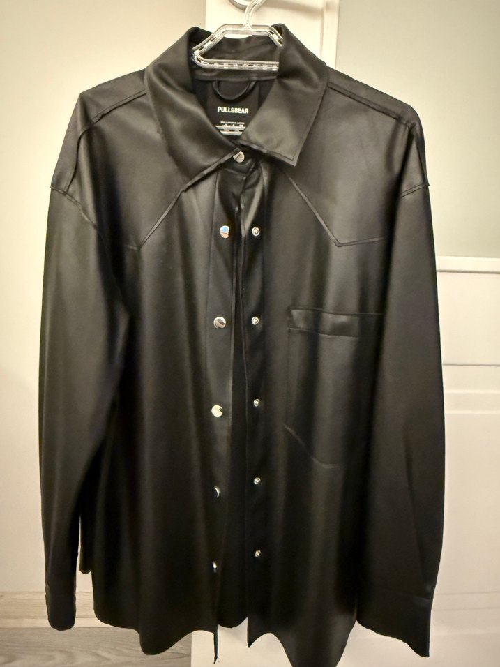 Düğmeli ön kısmı ve yakalı tasarımıyla siyah deri ceket. Uzun kollu ve regular fit, ofis ve sokak stiline uygun.