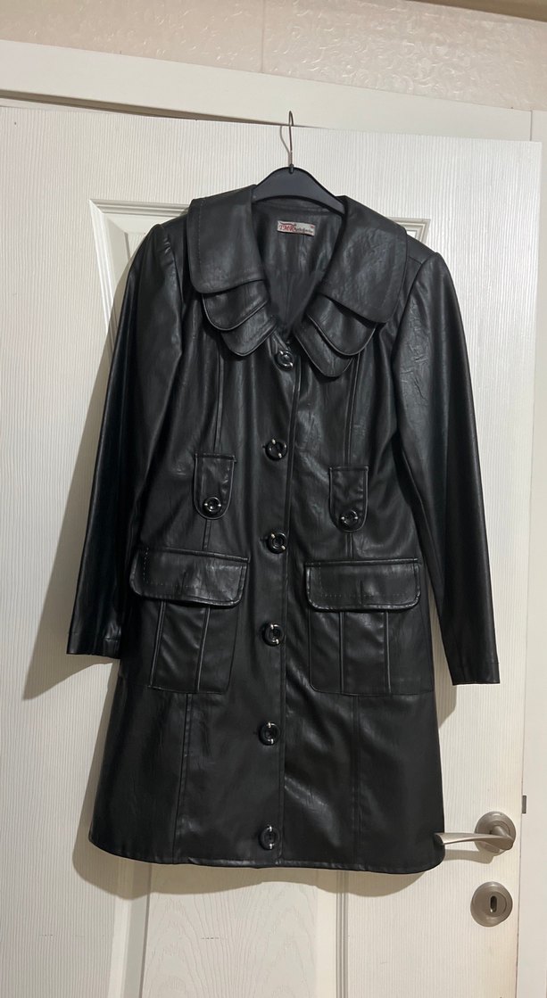 Düğmeli kapama ve kırmalı yakalı siyah deri kadın ceket. Midi boy, uzun kollu ve düzenli kesimle gotik tarzda şık bir parça.