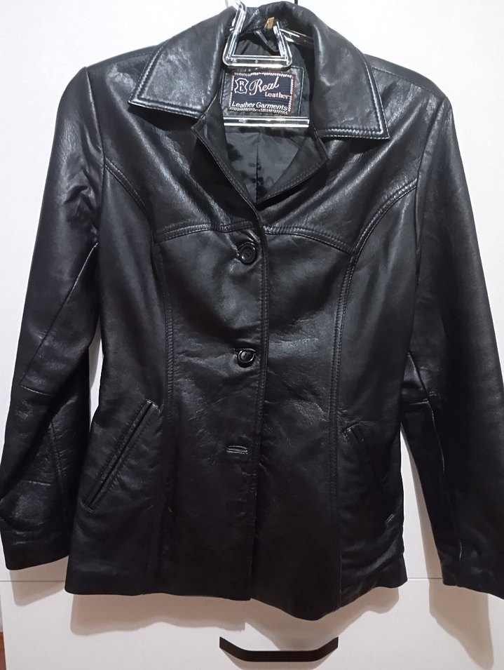 Siyah deri kadın ceketi, düğmeli ve kesik yakalıdır. Uzun kollu, klasik goth tarzında, ofis kullanımı için uygundur.