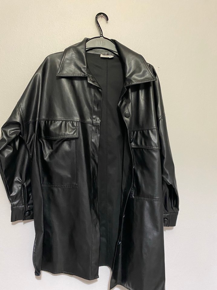 Düğmeli, uzun siyah deri ceket, keskin yakalı ve uzun kolludur. Rahat kesimiyle günlük sokak stili için uygundur.