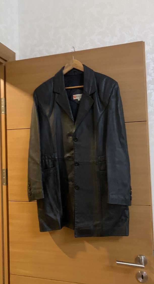Düğmeli siyah deri ceket, kesik yakalı ve normal boy midi uzunluğundadır. Uzun kollu, klasik ve şık bir ofis görünümü sağlar. Boy: 84 cm