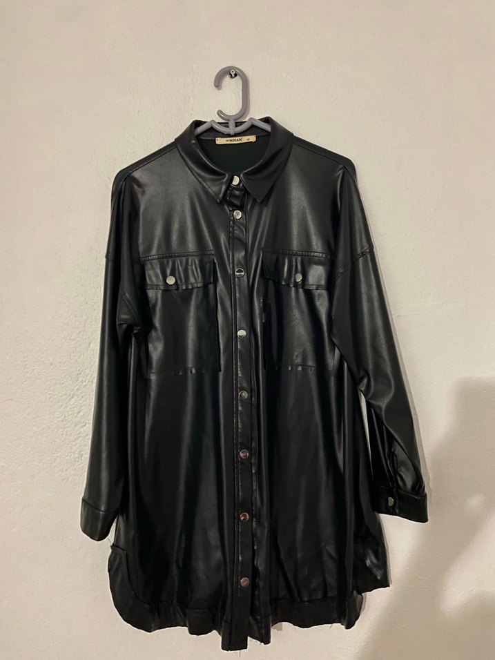 Düğmeli önü ve yakalı tasarımıyla siyah deri ceket, rahat kesimi ve uzun kollu