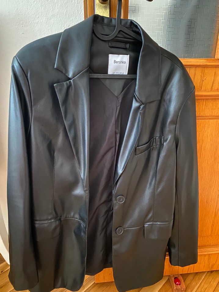 Düğmeli, siyah deri kadın ceket, normal midi boyda ve uzun kollu. Notch yaka ve düzenli kesim ile ofis ve sokak stiline uygun.