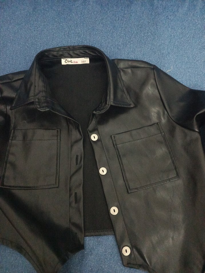 Düğmeli, siyah deri kadın ceketi, kesik yaka ve uzun kolludur. Normal kesim ve günlük kullanıma uygun sokak tarzı bir parça.