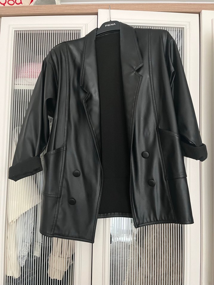 Düğmeli Siyah Deri Kadın Ceket