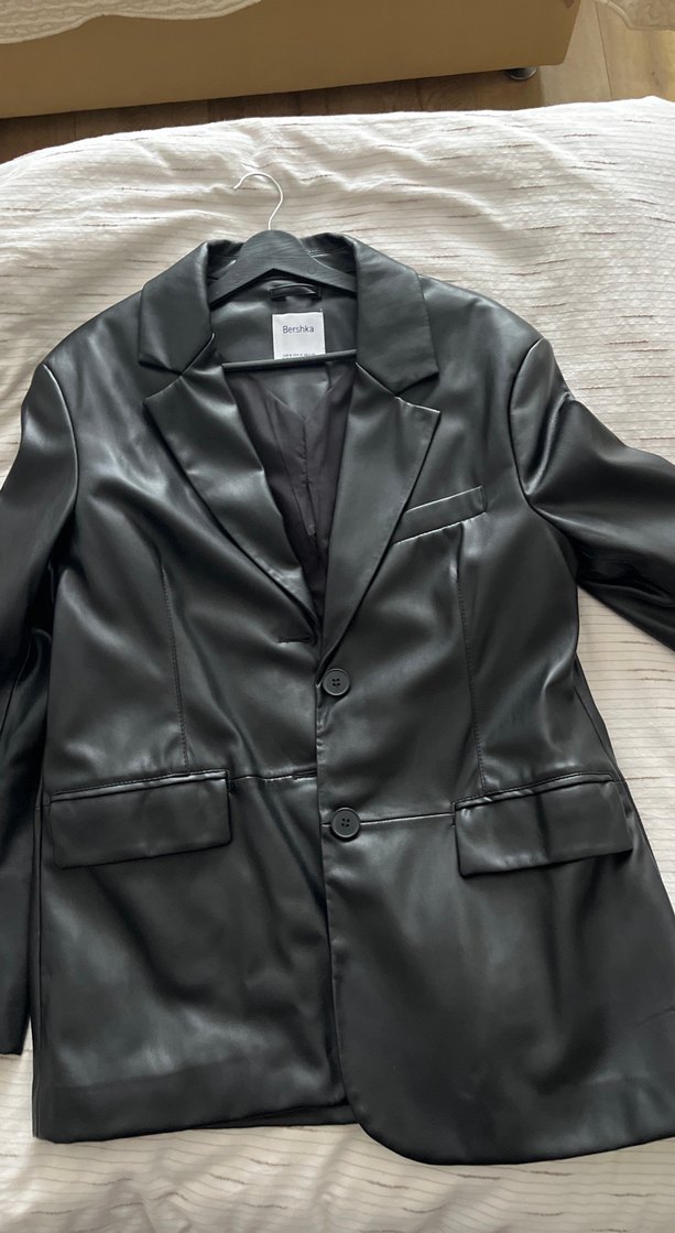 Düğmeli, siyah deri kadın ceket. Normal boyda, regular fit, ofis kullanımı için uygun. Strappy kollu ve desensiz yüzeye sahip. Hiç giyilmedi.