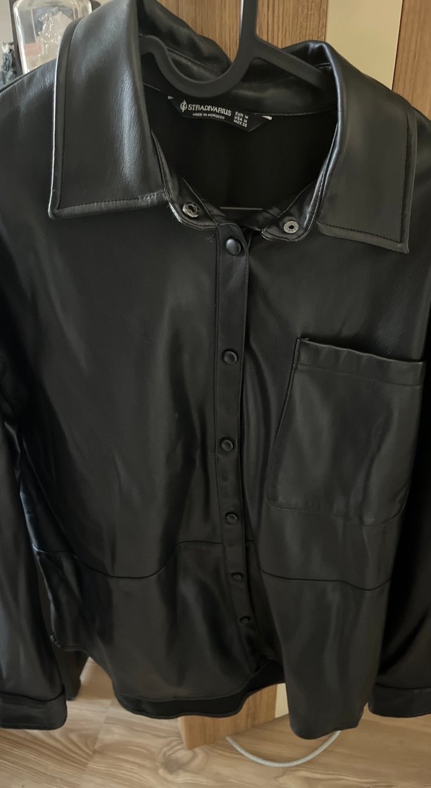 Düğmeli, yakalı ve uzun kollu siyah deri ceket. Regular fit ve midi uzunluğunda, sokak stili ve ofis için uygun.
