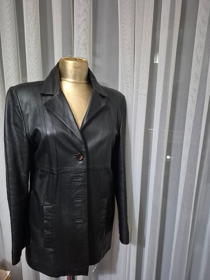 Düğmeli, siyah deri kadın ceketi, kesik yaka ve uzun kolludur. Ofis kullanımı için uygun, regular fit.ürün çok kullanılmamış hiçbir yıpranması yok gerçek deridir ceketin boyu 70 santim genişlik tek taraflı 45 santim kol boyu 55 santim omuz bir omuzdan öbür omuza 41 santimdir