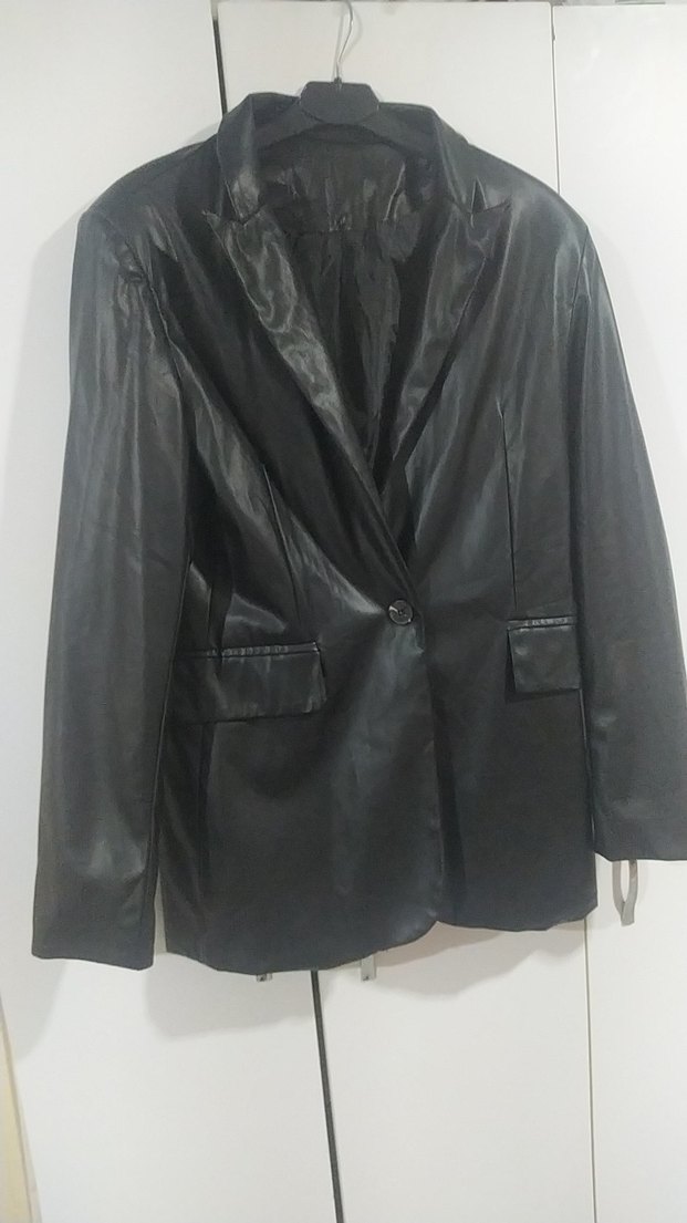 Düğmeli siyah deri ceket, keskin yaka ve uzun kolludur. Ofis için uygun, rahat ve şık bir görünüme sahiptir.