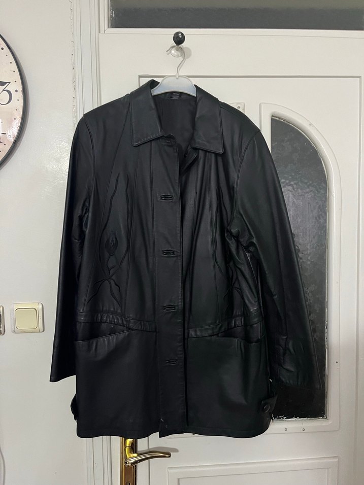 Düğmeli, siyah deri kadın ceket. Normal uzunlukta, uzun kollu ve regular fit yapısı ile ofis kullanımı için uygundur. Gotik ve Paris tarzında avant-garde görünüm sunar.