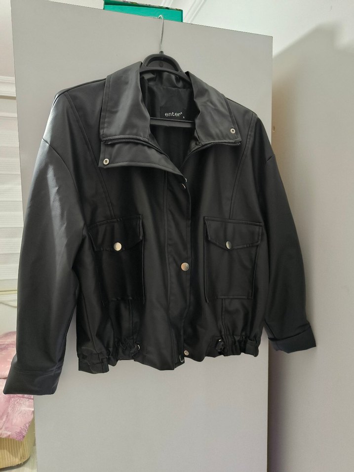 Düğmeli önü ve sivri yakası olan siyah deri ceket. Bol kesimli,normal boyda, günlük sokak stili için uygundur.