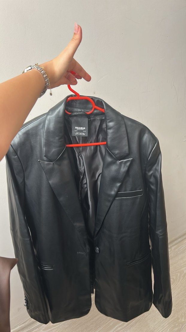 Siyah deri kadın ceketi, düğmeli ve kesik yakalıdır. Uzun kollu, normal midi boyutta ve günlük sokak stili için uygundur.