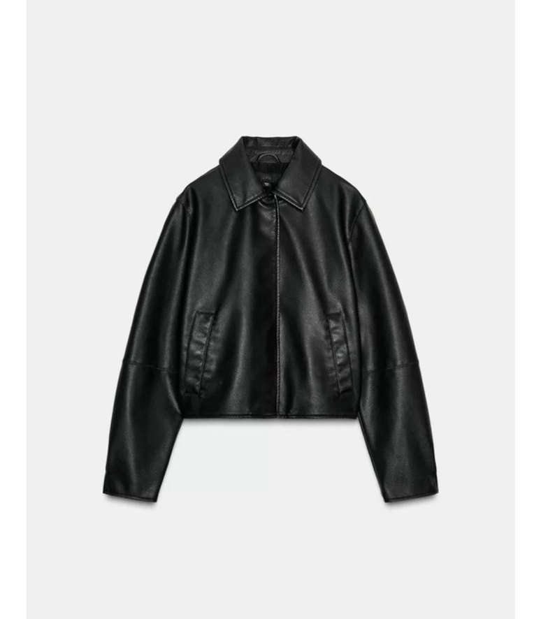 Düğmeli ön, uzun kollu ve kesik yakalı siyah deri ceket. Normal kesim ve midi boyda, ofis kullanımı için uygundur.