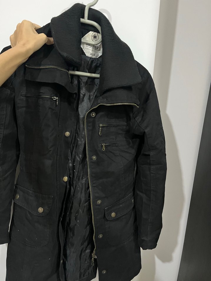 Düğmeli ve notalı yakalı, siyah deri kadın ceket. Uzun kollu, midi boy ve dar kesim, günlük kullanıma uygun şık bir sokak stili ürünü.